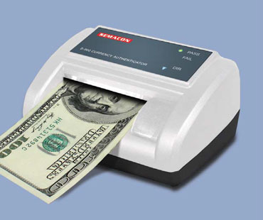 Semacon S-900 Series Compact Automatic Currency Authenticator Take large bills without fear of taking a phony. Smallest footprint in the industry. Rechargeable battery makes it portable. Easy to use: green light/red light – pass/fail. View Brochure